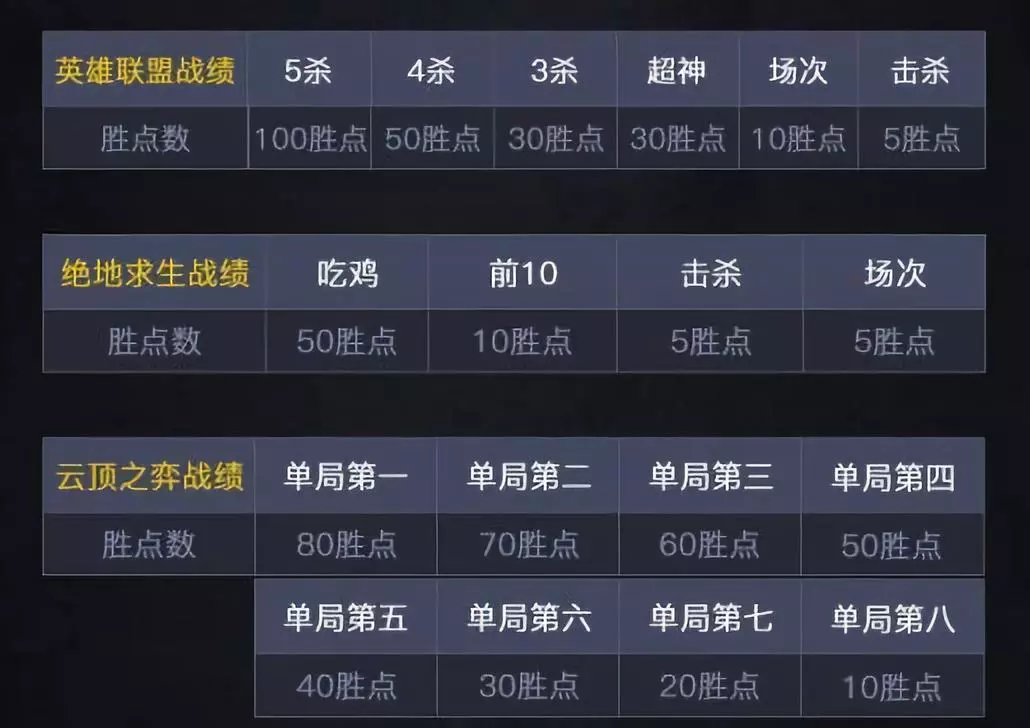 每場游戲可獲得相對應勝點,根據參與玩家的勝點對玩家進行排名
